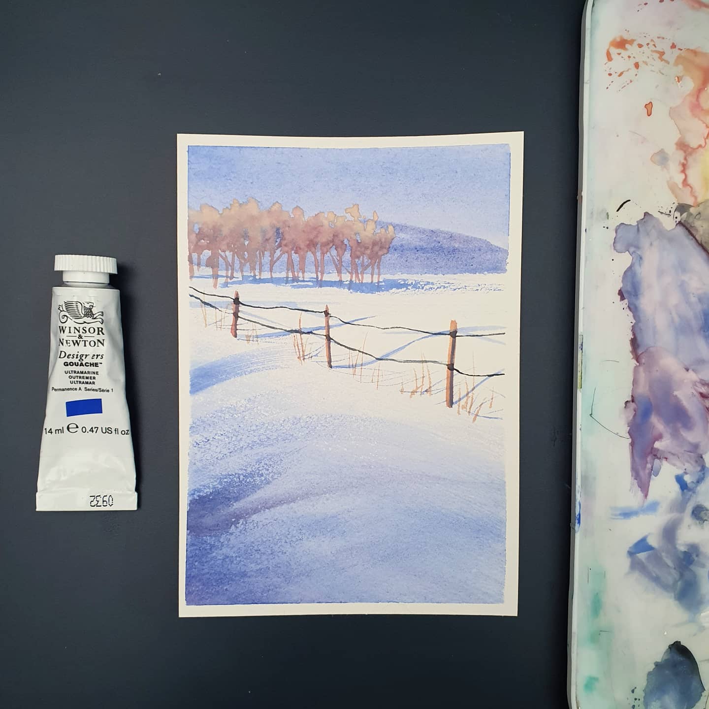 There’s something so fun about painting a snowy field with a fence, especially adding the long shadows. I like to paint the shadow first, visualizing the fence the whole time. It’s a fun game to see if I can anticipate where the shadows should fall.